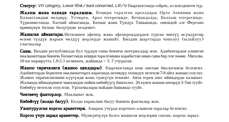 Status: VII category, Lower Risk/least concerned, LR/lc. Inhabits in Western and Northern Tien Shan, as well as in western part of Fergana Valley. Prefers plain semi-desert habitats with grass consisting of ephemers and ephemeroids. No data on numbers as well as on species biology for Kyrgyzstan are available. Wake period lasts for