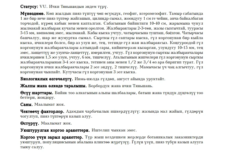 Лук пскемский Статус: EN. Очень редкий с сокращающимся ареалом вид Западного Тянь-Шаня. Описание....