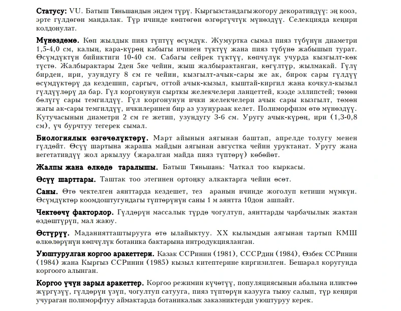 Status: VU. It is West Tien Shan rare endemic species, distributed in small areas in Chatkal River valley. This ornamental plant of high value for selection is easily introducing into culture and has wide intraspecific variability. It populates stony slopes in piedmonts and mid-montane belt. Number is 10 generative counted individuals per m2. Period of flowering: end of April - beginning of June; fruiting in May - August, depending on the elevation; reproduction is both vegetative (with daughter bulbs) and generative (by seeds). Limiting factors: excessive pasturage and collecting of flowers. There are necessary for conservation of the species: prohibition of development of virgin lands, prohibition of collection/trade of flowers and bulbs, limitation of pasturage in vegetation period, as well as creation of small protected territories and monitoring in different sites and habitats.