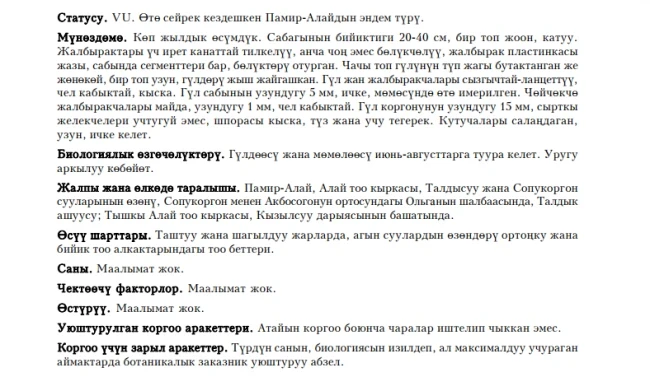 Status: VU. This rare perennial species is endemic for Alai-Pamirs. It is known from Alai Mountains (northern macroslope: basin of Gultcha River, Taldyk Pass) and Trans-Alai Mountain Range (Kyzyl-Suu and Altyn-Dara Ravines), and populates stony and metal precipitates with scanty vegetation at river banks, from mid-montane belt up to river heads. This plant is blossoming and fruiting in June - August; propagation is generative (by seeds). Data over the number in nature, limiting factors and cultivation are absent. These data are necessary for the elaboration of effective methods of species’ preservation.