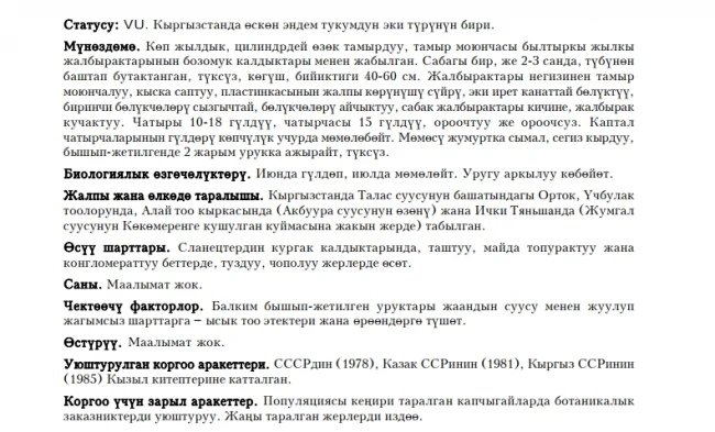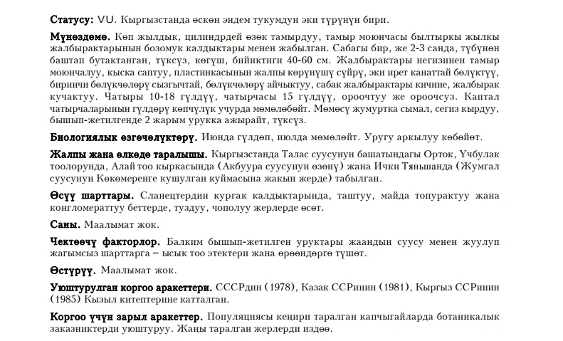 Status: VU. This mosaic-distributed species is one of two representatives of the genus which genus is sub¬endemic for Kyrgyzstan. These perennial plants in Kyrgyzstan were recorded in upper part of Talas River basin, in Ortok-Too and Utch-Bulak, in Alai Mountains (Ak-Buura Ravine) and in Inner Tien Shan (near junction Kokomeren and Jumgal Rivers), where were found at dry schistose screes, stony and silty-soil and conglomerate slopes and salted mottled clay. Period of flowering: June, fruiting in July; propagation is genera¬tive (by seeds) only. Data about number in nature and cultivation are absent. Possible limiting factor is the washing away by rain waters, from specific habitat to the piedmount zone with unsuitable torrid conditions. This species in listed in Red Books of USSR, Kazakhstan and Kyrgyzstan. Search for new populations and creation of botanical wildlife areas in sites with abundant populations are necessary to conserve the species.