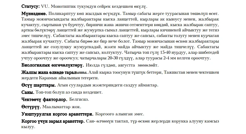 Кауфмания Семенова Статус: VU. Эндемичный, редкий вид. Описание. Многолетнее до 15 (20) - 30 (40)...