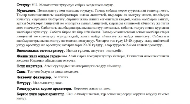 Рябинник Ольги Статус: CR B2ab(iii). Редчайший узкоэндемичный вид Алайского хребта. Декоративен....