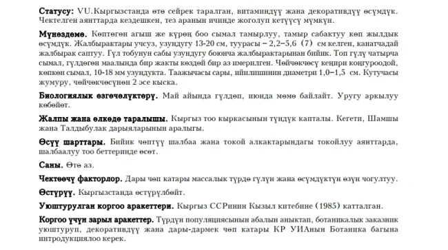 Виды высших растений, выведенные из «Красной книги» Кыргызстана (1985) Татаал тузулуштуу...