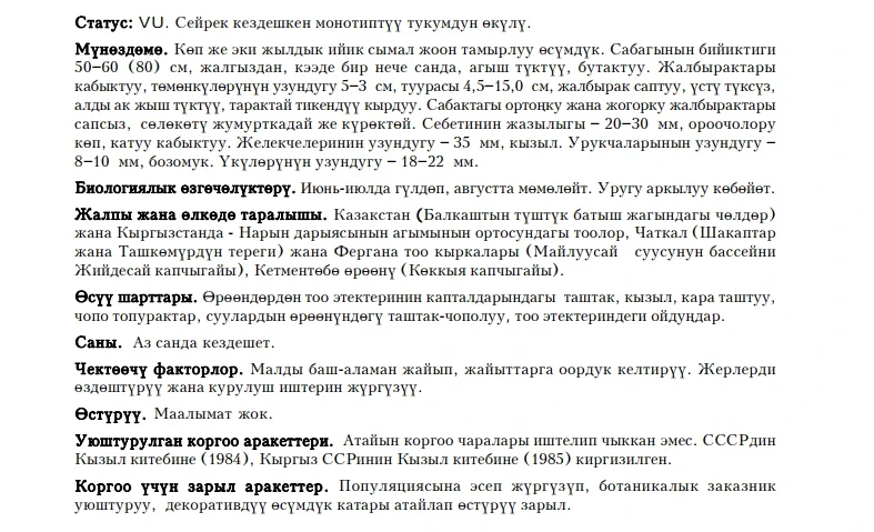 Status: VU. It is a rare mosaic-distributed representative of the monotypic genus, ornamental plant. The specific area includes limited territories in deserts near Balkhash Lake (Kazakhstan), in Ketmen-Tyube Hollow (Kok-Kyya locality) at northern macro-slope and spurs of Chatkal Mountain Range and in western part of Fergana Mountain Range (southern piedmonts in basins of Maili-Sai and Dzhide-Sai Rivers). The species occurs by sparse specimens at motley-clayey, loess and stony soils on slopes and in depressions in low- montane zone. Period of flowering: June - July, fruiting in August, propagation is generative (by seeds). Number in nature is small, the species is unstudied in a culture. Limiting factors are excessive pasturage, ploughing-up and weak reproduction in arid conditions. The species is listed in Red Books of USSR and Kyrgyzstan but there are not special protection for it. The creation of botanical wildlife area, inventory of
