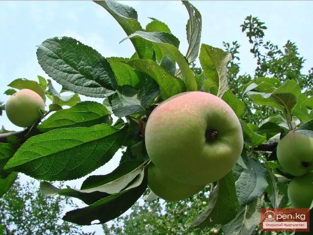 Яблоня домашняя, по-киргизски алма, из семейства Розоцветных. Дерево с овально-яйцевидными листьями. Цветки розовые или белые. Цветет с конца апреля до июня. Дает нектар и пыльцу. Широко разводится в зоне земледелия во всех районах Киргизии, кроме высокогорий. В садах занимает более 50% площади. Хороший медонос. Медопродуктивность—17,5 кг с га.