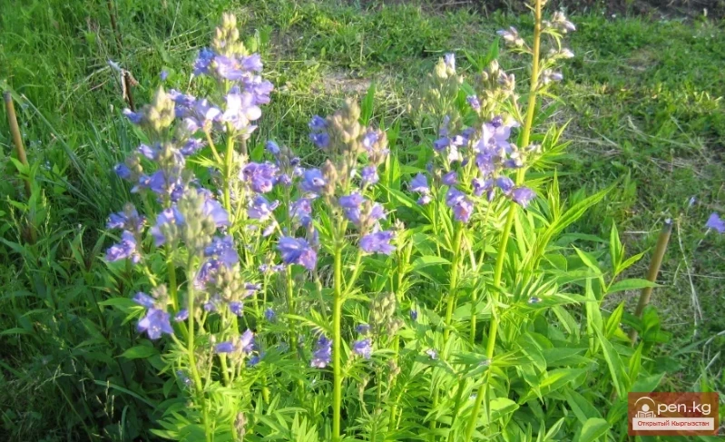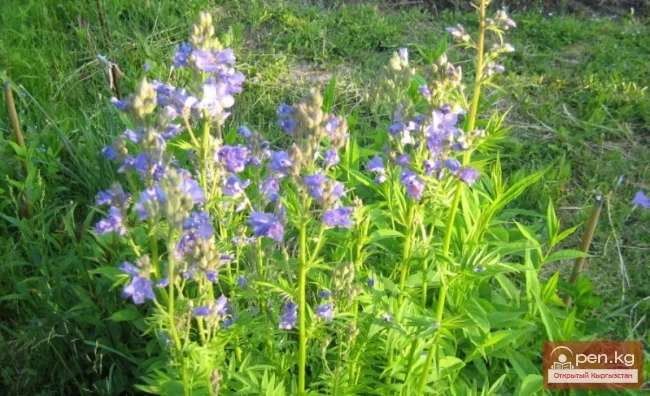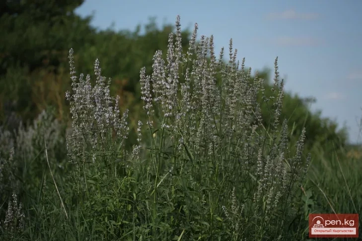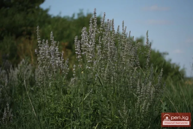 Шалфей прутьевидный, из семейства Яснотковых. Часто встречается на Юге Киргизии, особенно в поясе орехо-плодовых лесов на лугово-степных склонах. Местами он образует сплошные заросли, составляя более 50% травостоя.