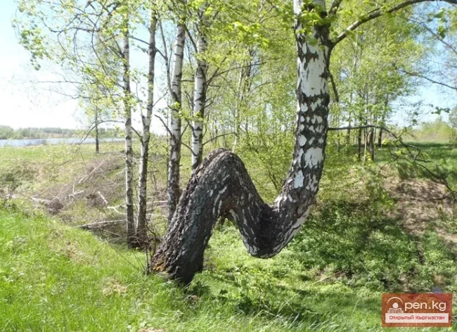 Береза кривая, из семейства Березовых. Дерево средней величины. Цветет в апреле и мае. Дает пыльцу и березовый сок. Пчелы берут пыльцу и клей. Растет в долинах горных рек во всех районах Киргизии. Охотно посещается пчелами.