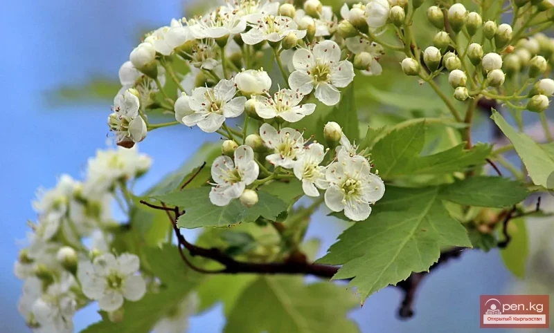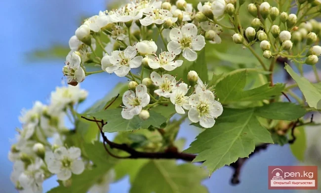 Боярышник сангорский, из семейства Розоцветных. Небольшое колючее дерево. Цветет в мае. Дает нектар и пыльцу. Растет по поймам рек и на склонах гор в поясе древесно-кустарниковой растительности в Малом и Большом Кемине, Киргизском, Чаткальском, Ферганском, Алайском и Туркестанском хребтах.