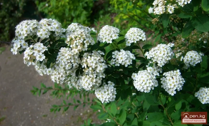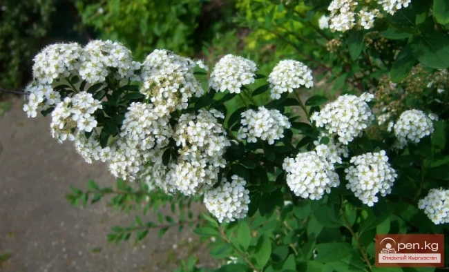Таволга зверобоелистная, из семейства Розоцветных. Сильно ветвистый кустарник до 150 см высотой. Цветки кремовато-белые. Цветет обильно в мае и июне. Дает нектар и пыльцу. Растет по склонам гор, среди кустарников, в арчовниках, а иногда в степях по понижениям, изобилующим влагой.