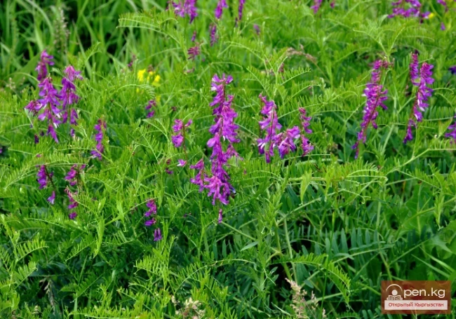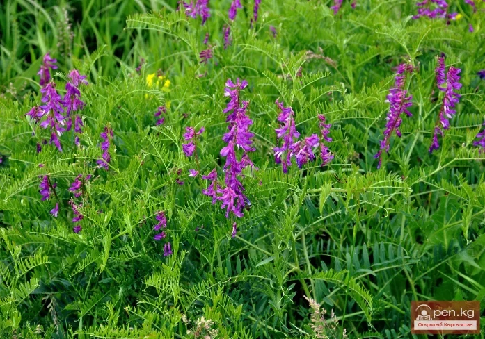 Вика тонколистная, из семейства Бобовых. Многолетнее растение от 150 до 180 см высоты с парноперистыми сложными листьями и с синефиолетовыми кистями цветков.