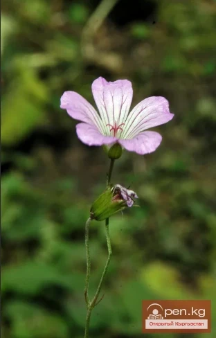Герань прямая, из семейства Гераниевых. Многолетнее растение до 60 см высоты с пальчатораздельными пахучими листьями и с крупными синевато-лиловыми цветками. Растет на лугах, в лесах, на лесных опушках, среди кустарников. Местами образует гераниевые луга, на которых создает основную массу травостоя.