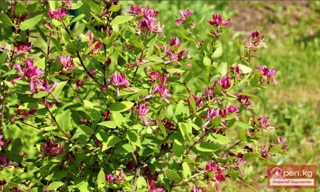 Жимолость татарская, из семейства Жимолостных. Кустарник 1—3 м высотой с розовыми цветками. Цветет в мае и начале июня. Дает нектар и пыльцу. Растет среди кустарников по опушкам лесов, по долинам рек в лесах.