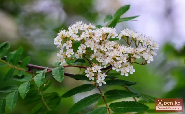 Рябина тяньшанская, из семейства Розоцветных. Дерево 3—5 м высоты, у верхней границы распространения растет кустар-ником. Цветет в июне, июле. Дает нектар и пыльцу. Распространена в лесах и среди кустарников повсеместно в Киргизии. Хороший медонос.