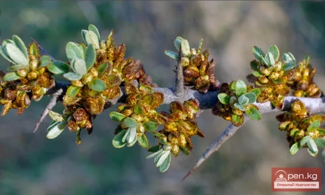 Облепиха крушиновая, из семейства Лоховых. В Киргизии широко распространена. Растет по долинам рек, ручьев, озер, образуя труднопроходимые заросли, которые носят местное название «джерганак». Облепиха растет кустарником или небольшим деревом. Стебли обильно покрыты колючками. Растение двудомное. Цветки мелкие, невзрачные: мужские желтоватые, женские зеленоватые, расположены на стеблях одиночно. Цветет весьма обильно с апреля до июня, дает нектар. Является хорошим медоносом.