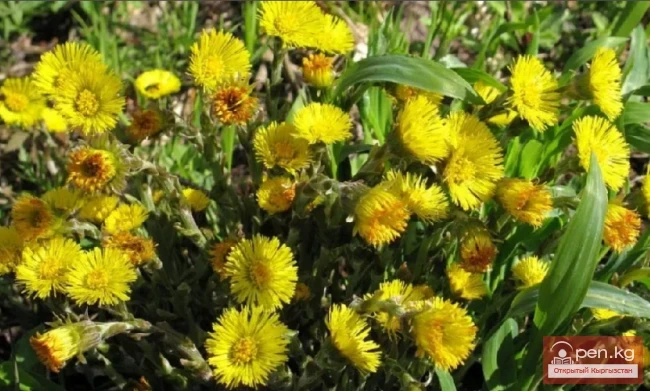 Мать-и-мачеха, из семейства Астроцветных. Как только растает снег, на глинистых обрывах в предгорьях хребтов, в поймах рек, по берегам ручьев, в оврагах появляются золотисто-желтые корзинки цветков. Это мать-и-мачеха. Она цветет в апреле — мае, до распускания листьев. Дает много нектара и пыльцы, а иногда только пыльцу.