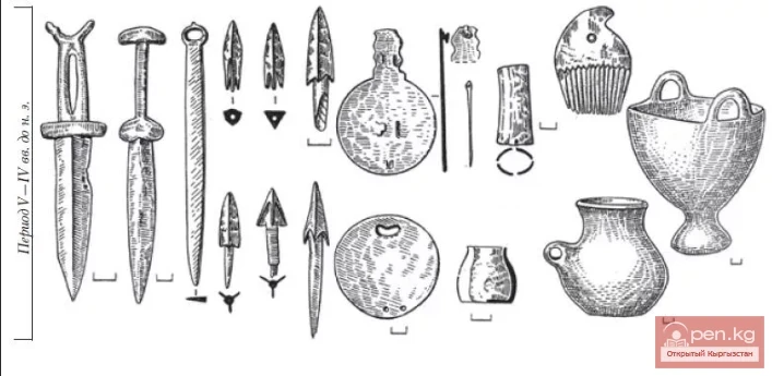 Сако-усуньский период (V в. до н. э.). Этот период представлен основной массой керамики и прежде всего сосудами с ручками в виде выступающих уплощенных или конических налепов. Подобные ручки характерны для восточно-ферганских поселений шурабашатской культуры. Нередко их находят в курганах сакского времени в Семиречье, в том числе в Прииссыккулье. Заметны связи сарыбулунской керамики и керамики из Восточного Казахстана.