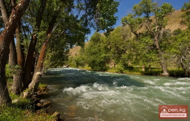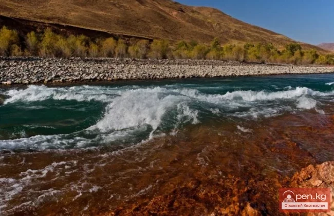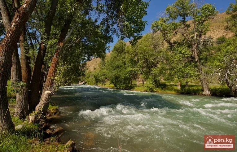 Ширина реки колеблется от 3-10 м в каньонах до 80-100 м в межгорных котловинах.Скорость течения 1.5-4.0 м/сек.