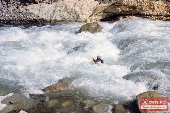 В следующей короткой котловине серьезный порог с прижимом на левом повороте Чаткала.