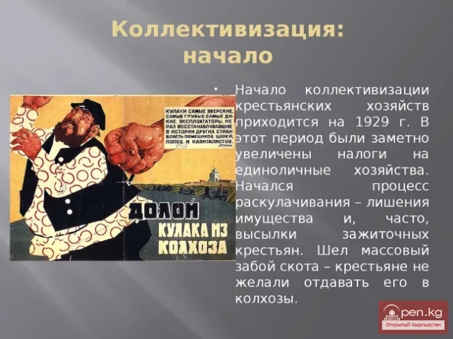 27 декабря 1929г. Сталин провозгласил лозунг «ликвидации кулачества как класса». 1929 год вошѐл в историю нашей страны, как год начала сплошной коллективизации. По всей стране начали создаваться колхозы. В селе Ключѐвка и его окрестностях была создана сельхозартель, которая называлась «Фрунзе».