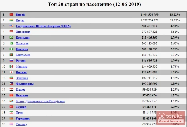 Более 70% населения Земли проживает в 20 самых густонаселённых странах мира. В мире всего 2 страны с населением более одного миллиарда человек: Китай и Индия. Несмотря на то, что Китай является самым густонаселённым государством, ожидается ,что примерно к 2023 году, население эти стран сравняется и Индия займет лидирующее положение.