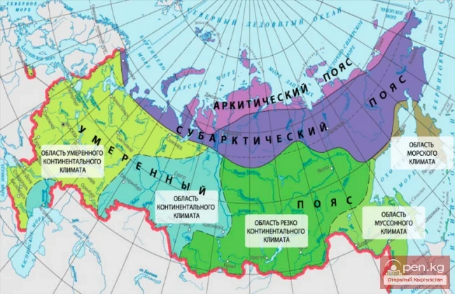 Положение России в северной части Евразии (территория страны в основном лежит севернее 50° с. ш.) обусловило её размещение в арктическом, субарктическом, умеренном и частично в субтропическом климатических поясах.
