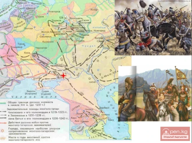 В 1237—1240 годах большинство русских земель подверглось разрушительному нашествию Батыя. Киев, Чернигов, Переяславль, Владимир, Галич, Рязань и многие другие древнерусские города были разрушены, южные и юго-восточные окраины утратили значительную часть оседлого населения. Русские княжества стали данниками Золотой Орды, и князья в них стали получать власть над своими землями с санкции ханов Золотой Орды. Этот период вошёл в историю как монголо-татарское иго. Новгородские земли в XIII веке вступили в серию военных конфликтов с рыцарями-крестоносцами и шведами за право доминирования в Восточной Прибалтике. Призванный новгородским вечем и посадниками князь Александр Ярославич Невский нанёс поражение шведским отрядам, высадившимся на Неве в 1240 году, а затем в 1242 году в Ледовом побоище нанёс поражение тевтонским рыцарям.
