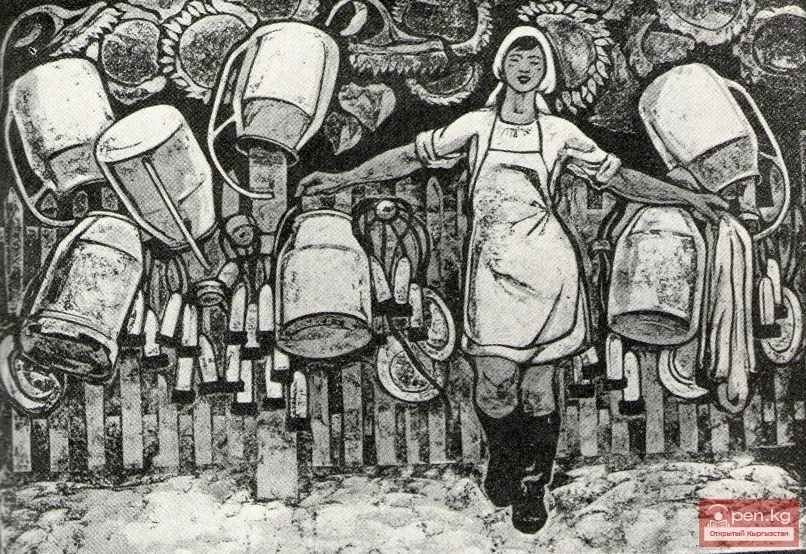 The place of the print (mainly linocut) occupies a significant role in the work of the multifaceted artist Theodor Theodorovich Herzen— a master of monumental painting, draftsman, and book illustrator. In engraving, as in other areas of Herzen's creativity, there lies a fundamental realistic foundation. He is an artist with solid professional training, clear artistic thinking, and a commitment to working from nature. Typically, his easel graphic compositions are expansive narrative stories that depict the history and contemporary life of the republic, its people, and nature. He particularly loves rural themes. Growing up among mountainous nature, with people close to the land, simple rural workers, he draws inspiration from the simplest yet infinitely dear motifs of Kyrgyz nature. The artist often translates natural images into graphic material (linocuts "Cool Stream," 1966; "Autumn in Kichi-Kemine," 1967; "Poplars," 1967; "Warm Rain," 1968; "Silence," 1969; "Mountain Stream," 1976).