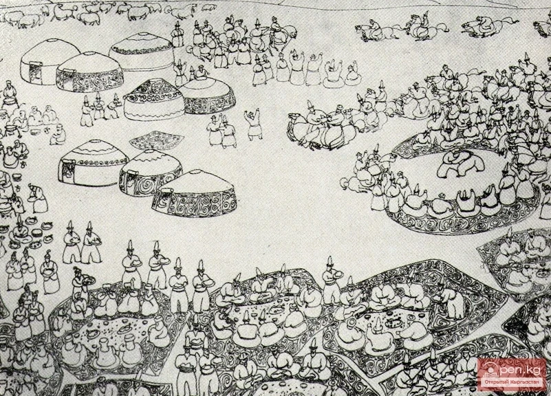 The feather and pencil drawings by B. Koshoyev are distinctive, abundant with mass scenes, character types, details from folk life, and panoramic landscapes of nature (“Toys,” 1968, ink; “Mountains,” 1974, pencil; triptych “Spring of the 60th Anniversary of October,” 1977, gouache; series “Kyrgyz National Games,” 1979, gouache, etc.). Despite the conventionality of the images, they are characterized by a delicate observation, precision of the contour line outlining figures and objects with a light artistry. The expressiveness of Koshoyev's individual style is connected with the creative assimilation of the aesthetics of the art of ancient and modern peoples of the Far East, such as Mongolia, Yakutia, and others. The author typically chooses an interesting viewpoint on the depicted events (as if from the height of a mountain), which allows him to encompass crowds of people, a multitude of events, broad landscapes, and settlements, composing them into cohesive, interconnected, yet localized groups united by some action.