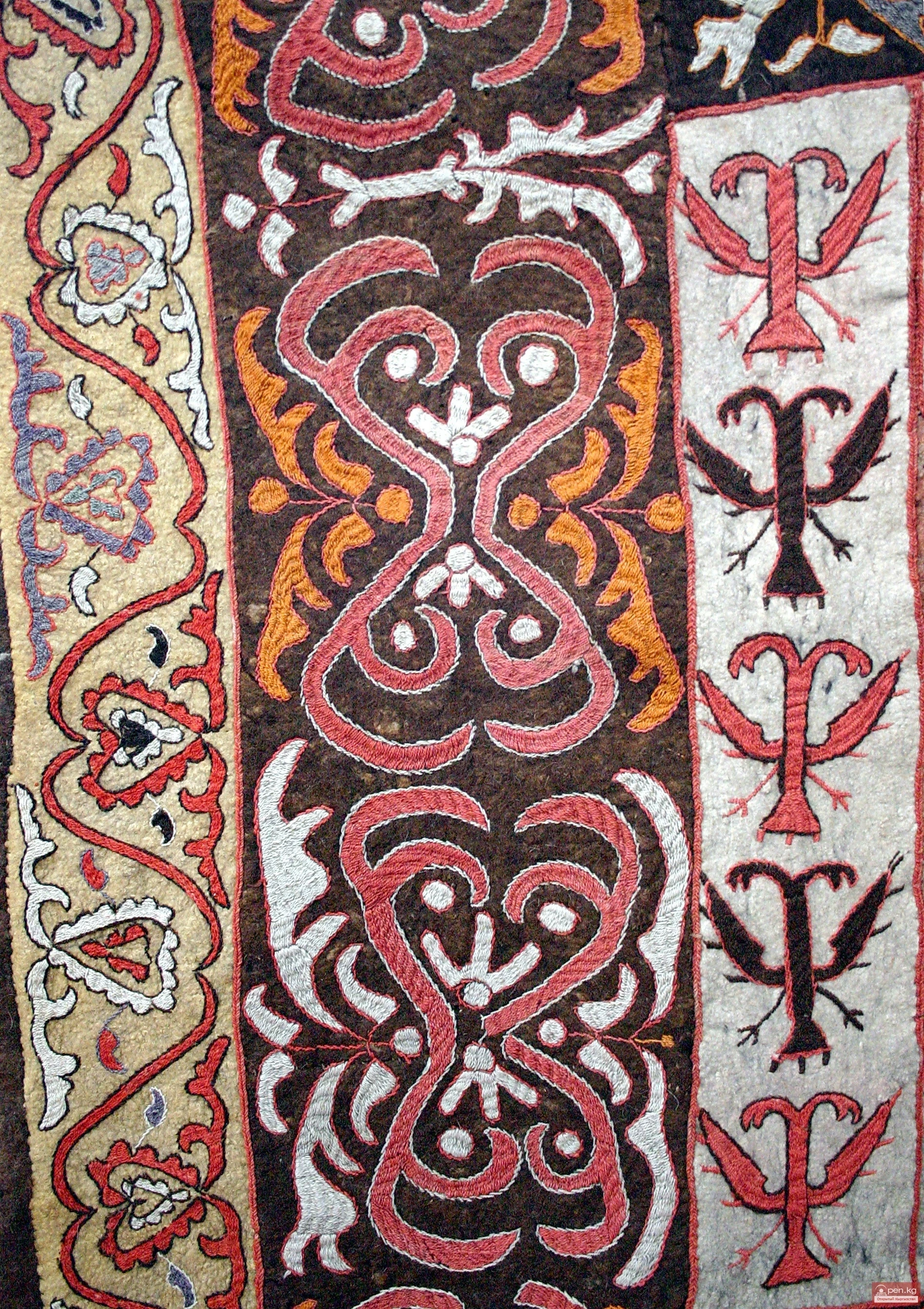 The Kyrgyz people created a rich ornamentation, numbering over 3,500 known combinations. It features several groups or complexes that are in one way or another characteristic of the art of other peoples of Central and Central Asia, however, the greatest closeness and even kinship is observed in Kyrgyz and Kazakh ornamentation. The main defining complex of the decorative art of the Kyrgyz people includes motifs that include various variants of mueiz (horn-like elements), waves with curls, palmettes, cross-shaped figures, and some others. Researchers conditionally call this complex “Kipchak,” as it is found among a number of contemporary peoples, in the ethnogenesis of which the Kipchaks participated. It was finally formed in the environment of late nomads in the 9th-12th centuries, but its roots can be traced back to the 6th-5th centuries BC. The ancient items made of felt, leather, and wood discovered by Soviet archaeologists during excavations of the burial mounds of nomads from the Saka period in Altai allow us to conclude that certain traditions of this art undoubtedly underlie the artistic samples created by Kyrgyz masters. In the appliqués on the felt carpet from the fifth Pazyryk burial mound and on the leather decorations of horse harness from the first Tüektin burial mound, one can see patterns that researchers consider prototypes of Kyrgyz ornamental compositions. There are cross-shaped and rhombic figures with horn-like curls, rhombic nets, and many others.