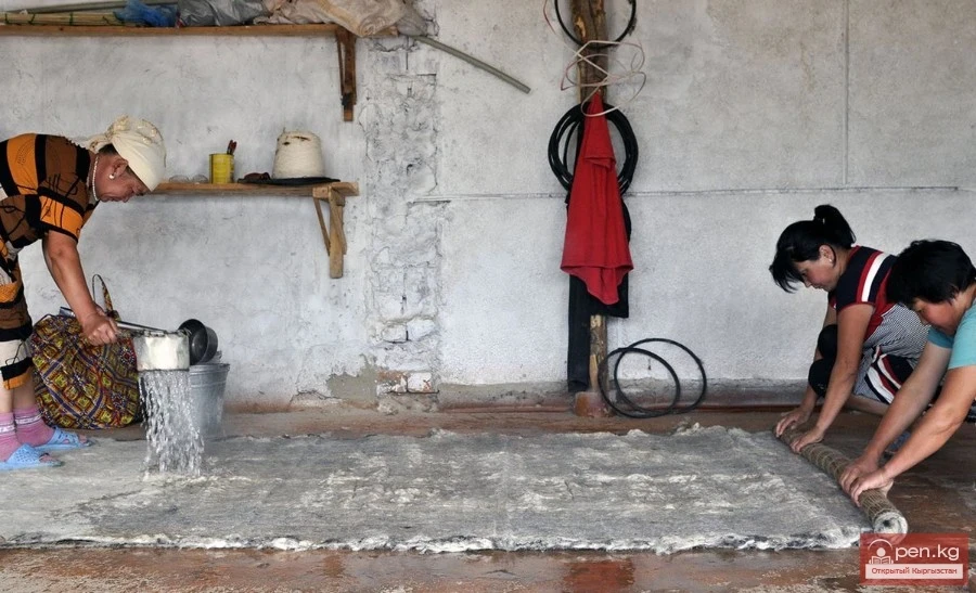 In addition to camel wool, goat wool is widely used for the foundation, which is significantly strong but coarse, resulting in a rough fabric. Recently, carpets have mainly been made from goat wool in the Lailak, Batken, and southern Alai regions. Sometimes white goat down is used for the pile (tuft). However, sheep wool, mainly gray in color and less frequently brown, is most commonly used in the carpet products of the Osh Kyrgyz. It is used for the foundation, weft, and pile.