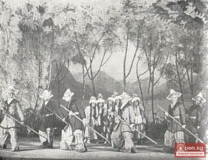 In the roles of Kadyir and Anar's friends performed the theater students K. Niyazaliev, Sh. Gafarov, P. Lozovoy, Z. Shakhvorostova, B. Beishenbaeva, N. Konurbayeva, Yu. Kuldarova, O. Terentyeva, and other artists who demonstrated extraordinary abilities as dancers. However, it cannot be said that everything was resolved regarding ballet art during that period. This is far from the case. The young artists still did not have sufficient professional training, and often dance was replaced by pantomime (for example, the part of Bagysh was resolved this way; the performer was artist G. Avtandilov). There were many such pantomime moments, which testified to the imperfection of the young ensemble. The performance involved actors who had no choreographic training at all. For instance, the role of Kudake — the servant of the manap Bagysh, was performed by dramatic actor Muratbek Ryskulov. However, performing in the ballet, he displayed lightness and an enviable sense of rhythm. An impressive scene was when Kudake-Ryskulov brings the chapan of the supposedly deceased Kadyir, and for this, Bagysh gifts him a rich tebetey.