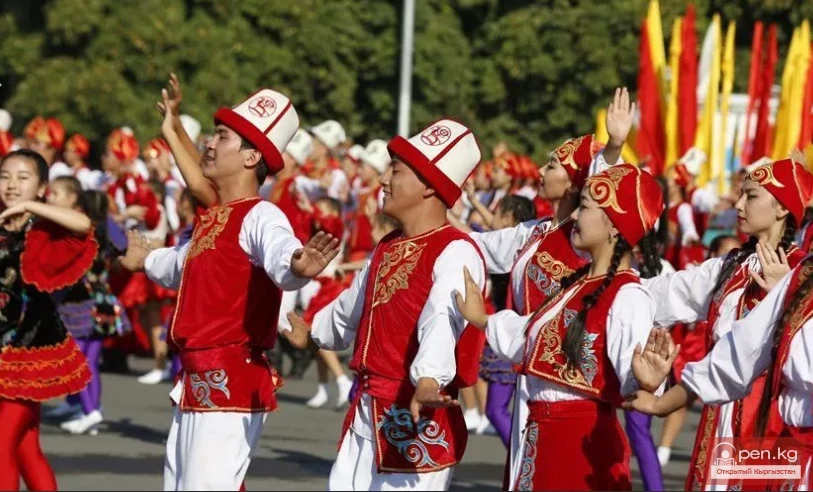 The young women, positioned in the lower left and upper right wings with eight each, come out one after the other (four steps, starting with the left foot). The young men are in lines. Then the young men turn around themselves over their left shoulder (hands on the waist) and sit on the floor: the right leg is crossed over the left, squatting deeply on both legs, gradually lifting their heels off the floor and spreading their knees. The body is straight, with an imaginary komuz in their hands (see Fig. 142).