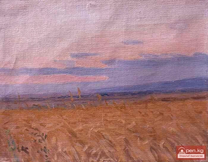 In the paintings of Sabyrbek Akylbekov, the color palette is restrained but built on complex subtle shades. The landscapes are soft and harmonious in color, and although the artist avoids bright colors, his painting palette is tense and accurately expresses the majestic, strict hues of the native nature. The canvas "In the Fields of Kyrgyzstan" (1953) is the pinnacle of his creativity during this period. In this work, the features of the new life of Soviet Kyrgyz peasantry are conveyed with keen observation, and the dynamics of the collective farmers' work in the field can be felt. The early morning is depicted in tender blue tones that dominate the painting. The combination of the yellow color of ripe wheat, the tender blue sky, and the bright red spots of the farmers' clothing creates a joyful harmony of colors.