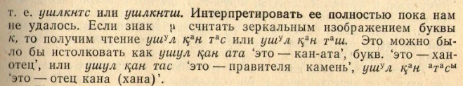 By its graphics and reading, the inscription can be attributed to the "s"-group of languages (dialects), since in the word тас instead of ш an с is written. Such variation was once attributed by I. A. Batmanov to dialectal affiliation. In the Orkhon-Yenisei monuments, this interchange or fluctuation s/sh is found in many texts.