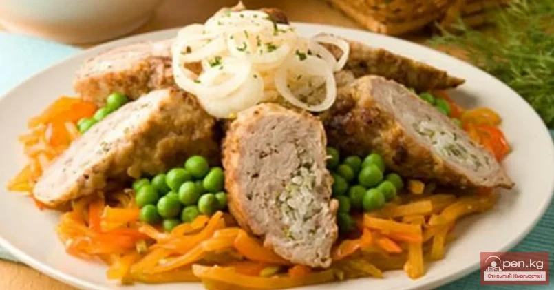 For the filling, chop the raw fat, onion, and garlic into small cubes, finely chop the jussai, drizzle with vinegar, mix, and leave to marinate for 1-2 hours, then add the steamed rice. Rinse the meat, clean it from membranes and tendons, cut it into 4 portions, slightly pound it, and salt it. Place the filling in the center of the pounded piece of meat, roll it up, dip it in an egg wash, coat it in flour, fry it in fat, and finish cooking in the oven. Cut the radish and sweet pepper into strips and fry in vegetable oil; after 5 minutes, add tomato puree and finely chopped garlic, and combine with the meat. Slice the onion into half rings, add sugar, salt, drizzle with vinegar, and leave to marinate for 30-60 minutes.