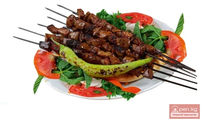 Shishkebek is a dish from Kyrgyz cuisine, consisting of kebab made from lamb or beef, marinated in onions and vinegar with the addition of spices.
