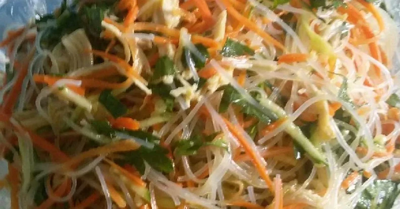 Cut the carrot and radish into strips, rub with salt, squeeze out the juice, season with pepper, mix with starch noodles and finely chopped garlic, and dress with vinegar and cooled heated oil.