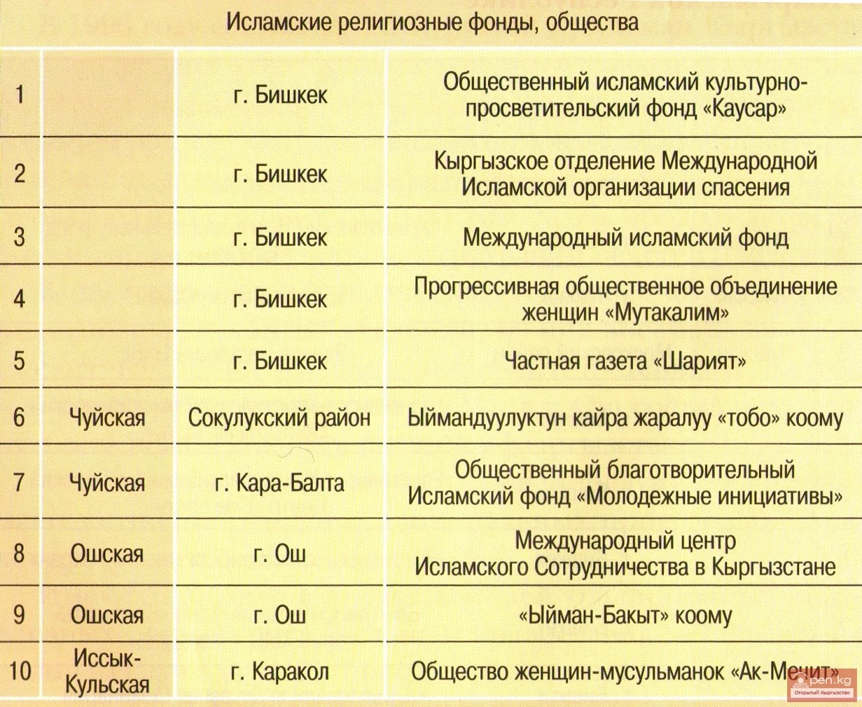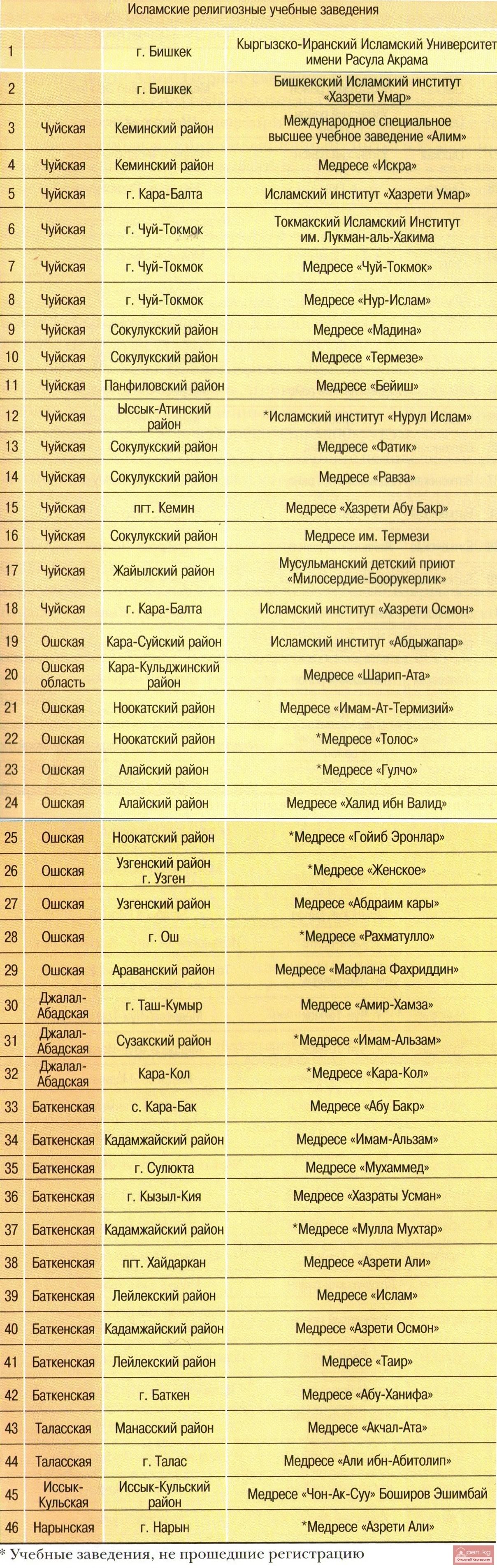Currently, there are more than 48 Islamic religious educational institutions, including eight Islamic institutes and one higher university. Nine qaziats and the southern representation of DUMK in the city of Osh form a unified network of Islamic organizations in Kyrgyzstan.