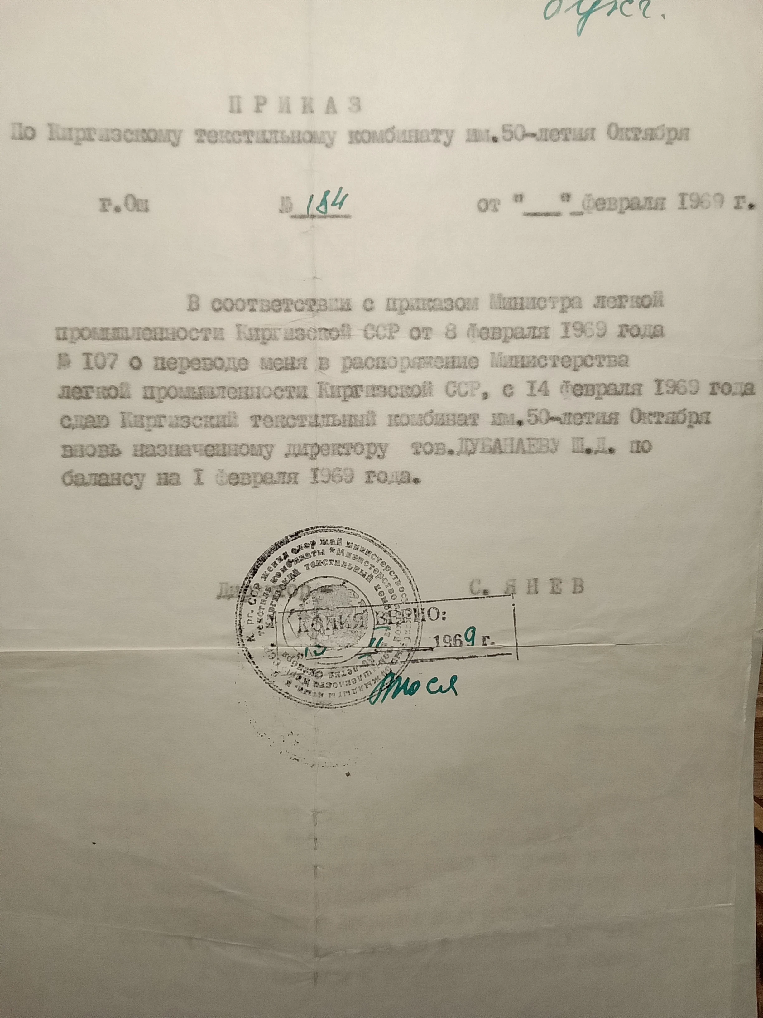 Workers from the October 40th factory and the Osh HBC loved their director; he maintained relationships with them even after being transferred to another job.