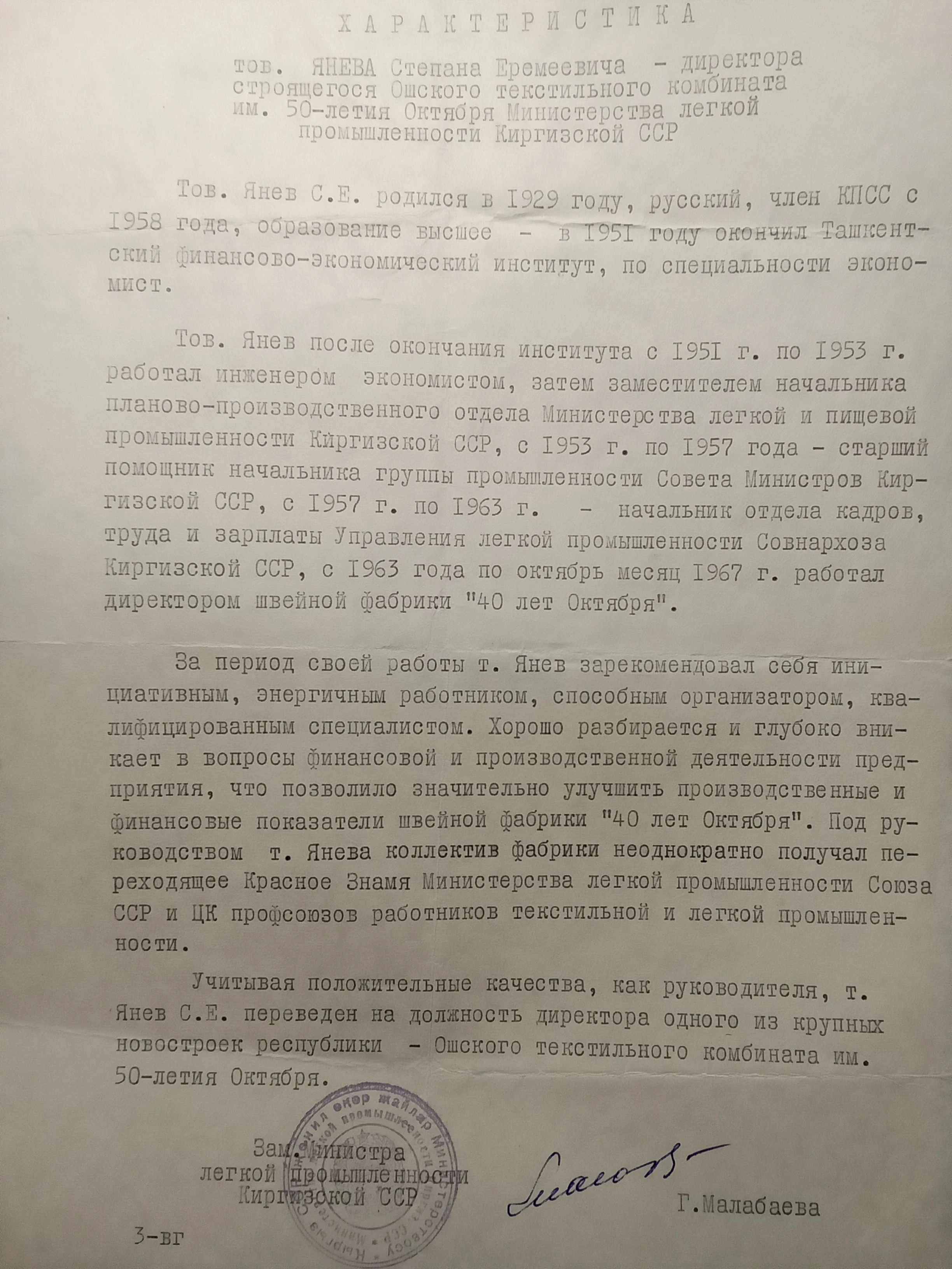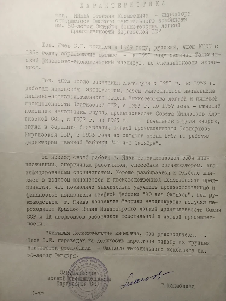 Stepan did not know his father Yeremey, as he was repressed during the Stalin era. Stepan graduated from school in Maevka in 1946, and after finishing the economic institute in Tashkent in 1951, he returned to Kyrgyzstan, where he worked in the management structures of the light industry of the Council of Ministers and the Council of National Economy. From 1963 to 1967, he served as the director of the October 40th garment factory in Frunze. Under his management, the factory achieved outstanding economic results and became well-known throughout the Union, for which S. E. Yanev received an award and in 1967 was appointed director of the large Kyrgyz textile combine being built in the city of Osh (HBC), where he worked until it was commissioned in 1969, for which he was awarded a state medal.