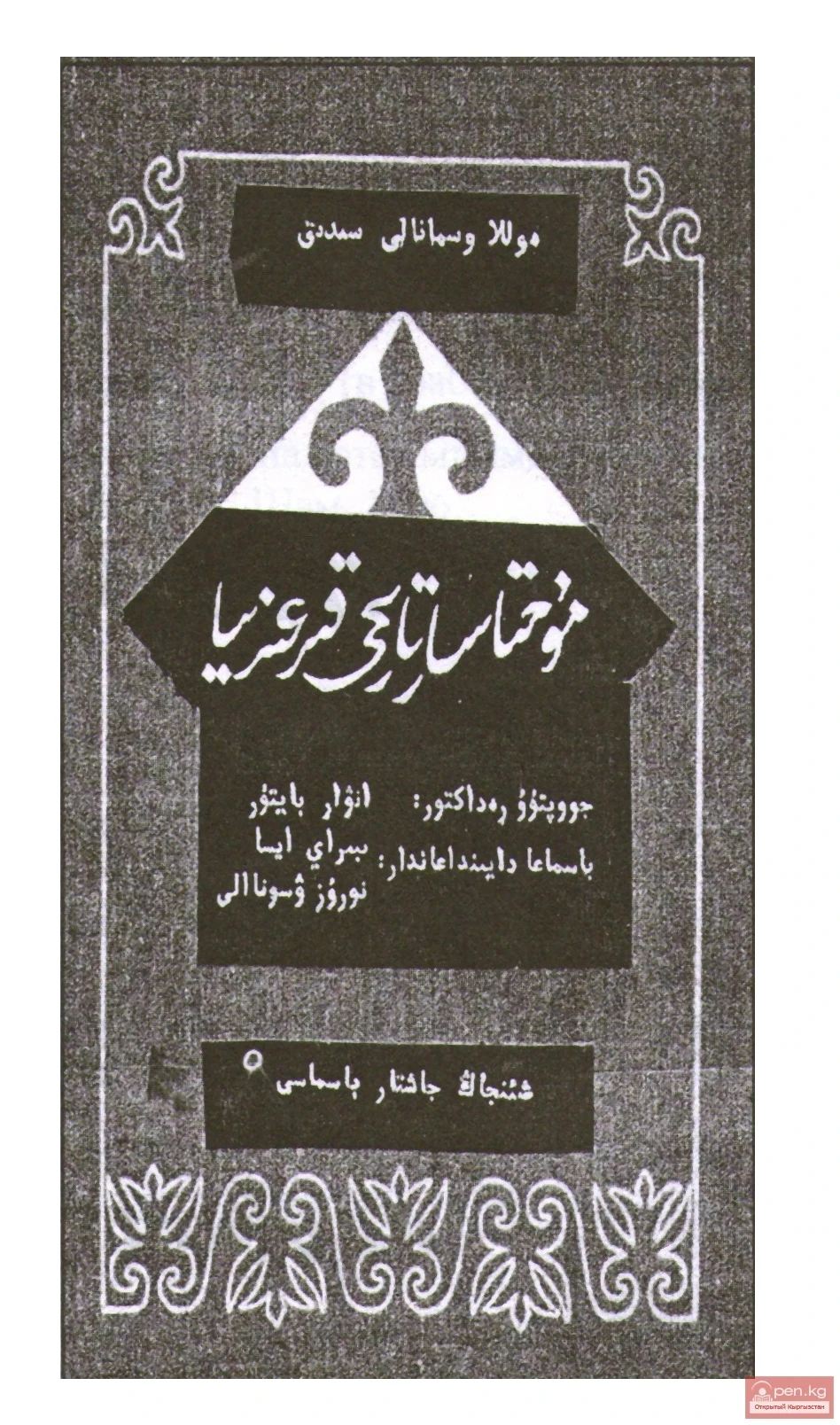The title page of the book by O. Sydyk uulu "A Brief Summary of Kyrgyz History," published in 1986 in Urumqi in Arabic script under the editorship of Anvar Baytur. This book reissued two works by O. Sydyk uulu - "Mukhtasar tarykh-i kyrgyziyа" (1913) and "Tarykh-i kyrgyz shadmaniyа" (1915), published in Ufa.