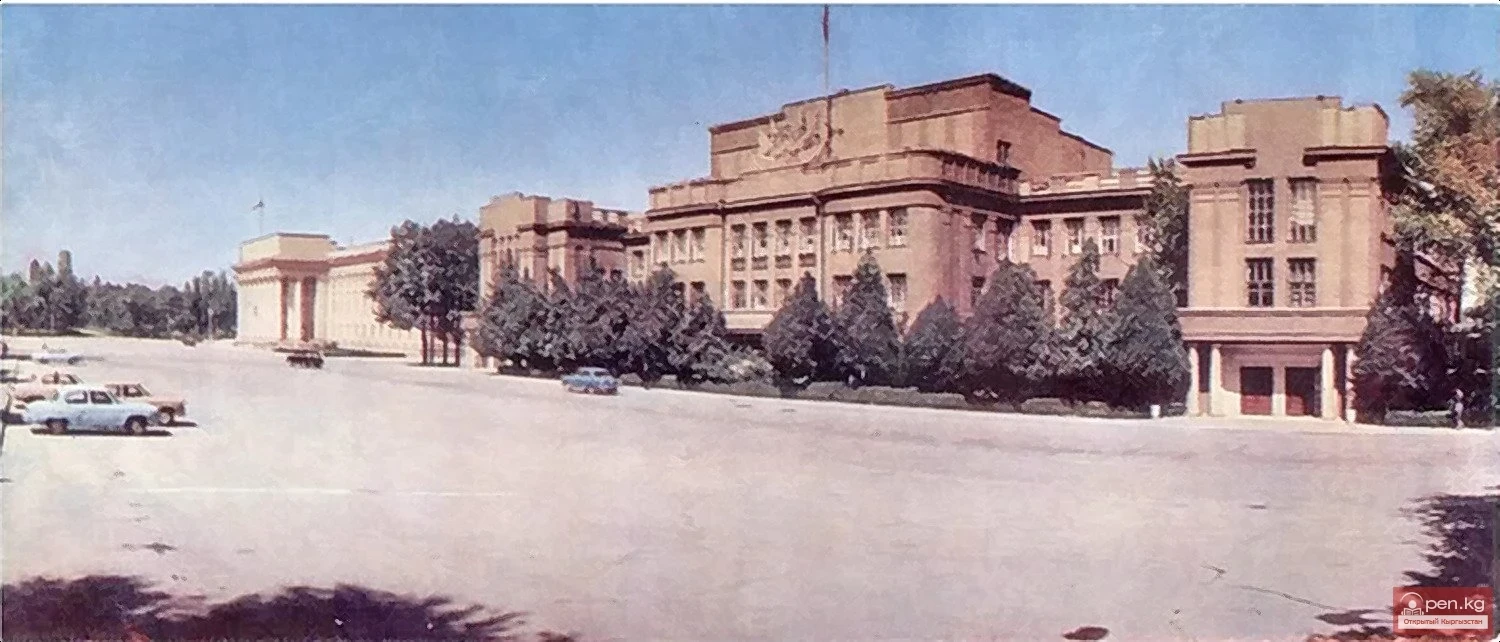 The largest construction by Y. B. Dubov is the Government House of the Kirghiz SSR. The construction was completed in 1936, for the nineteenth anniversary of the Great October. The building is located on Kirov Street, in the very center of the capital, on the former Central Square. It is designed in simple monumental forms with a clear and distinct layout of the premises. The most interesting part of the interior of this structure is the hall (now the hall of the Union of Writers of Kyrgyzstan), located on the second floor of the western wing of the building. A spacious ceremonial vestibule, a cozy staircase, and halls lead to a well-lit, two-light room.