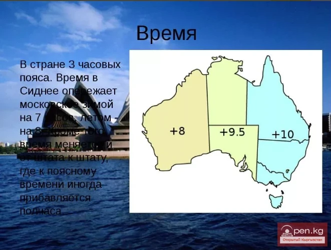 This continent has three time zones. When it is eight o'clock in the morning in the left part of Australia, it is not nine o'clock in the central part, but 9:30. And in the right part, it is exactly ten in the morning. As the famous joke goes, "This is impossible to understand; it can only be memorized." The 15-minute difference in Nepal at least has a political meaning, while Australia is still a unified country.