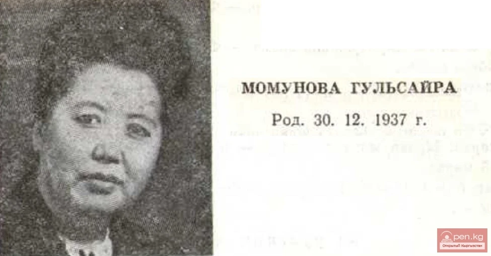 Poet G. Momunova was born in the village of Ken-Aral in the Leninpol district of the Talas region in a peasant family. In 1955, she graduated from Secondary School No. 1 in the city of Talas, and in 1960 from the V. Mayakovsky Kyrgyz State Pedagogical Institute.