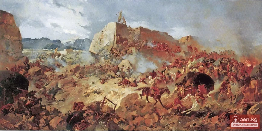 In mid-January, the uprising on the right bank of the Syr-Darya in the area of Kamysh-Kurgan and Chil-Makhrama gained significant intensity. Several groups of rebels operated here, each consisting of 200 to 2000 people. On January 16, in the southeast of Khojent — in the gorge between Kamysh-Kurgan and Samgar — a part of the rebels numbering 150 attacked the caravan of merchant Gromov, capturing 300-450 camels, 50 guides, and several horsemen. Another group of rebels, consisting of 200 Kyrgyz, approached the kystaks of Bish-Aryk and Bakhman, whose residents joined them. On January 18, a part of the rebel Kipchaks numbering 150 horsemen, led by the son of Abdul-Gafar Aktuba, captured the elder of the Basmandin, Faiza, 4 horsemen, and the junior assistant to the head of the Zaravshan district — Murad-bek. The latter was killed. In mid-January, Pulat-khan with a significant part of the rebels continued to occupy the city of Margilan, where he moved in early December from the kystak of Assake, where this leader had been in October and November. Now, in the mentioned kystak, there were 15,000 rebels led by Abdurakhman Aftobachi. In this kystak, the rebels decided to resist the punitive forces. They took a strong position on the road to Assake behind the Aryk Sharikhan-Sai, dismantled the bridge, and blocked the street with debris. On January 18, the tsarist punitive detachment, led by Major General Skobelev, approached Assake and attempted to take it by storm. The rebels put up stubborn resistance to the punitive forces and retreated, leaving 200 dead and many wounded on the battlefield. Even after the battle of Assake, the rebels continued to resist the punitive forces.