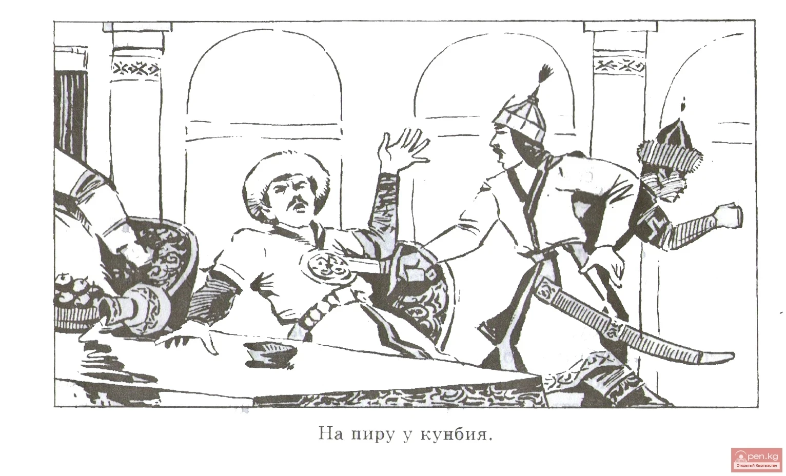 ... In the midst of the feast in the palace of the widow of the Usun kunbag Unguymi - the Chinese princess Gyai Yu. In the large hall with two columns, the leaders of the Usun tribes enjoy Ferghana wine, specially brought for the celebration, kumys, and eat fatty meat with appetite. The table is laid with all sorts of dishes, fruits, and sweets.