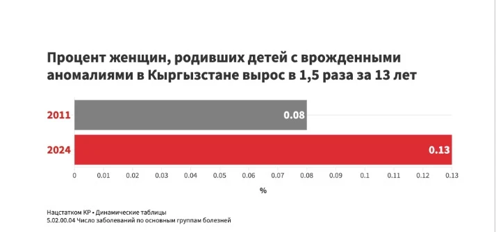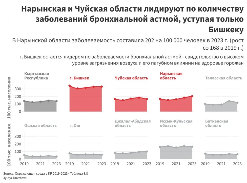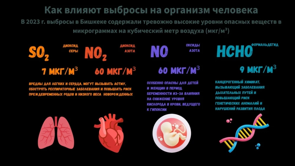 Research shows that in Bishkek and the Chui region, an increase in diseases among pregnant women and children is expected, as well as an increased likelihood of adverse pregnancy outcomes due to high concentrations of pollutants. In the Osh (11.2%) and Jalal-Abad (8.2%) regions, there is also an increase in diseases among women of reproductive age.
