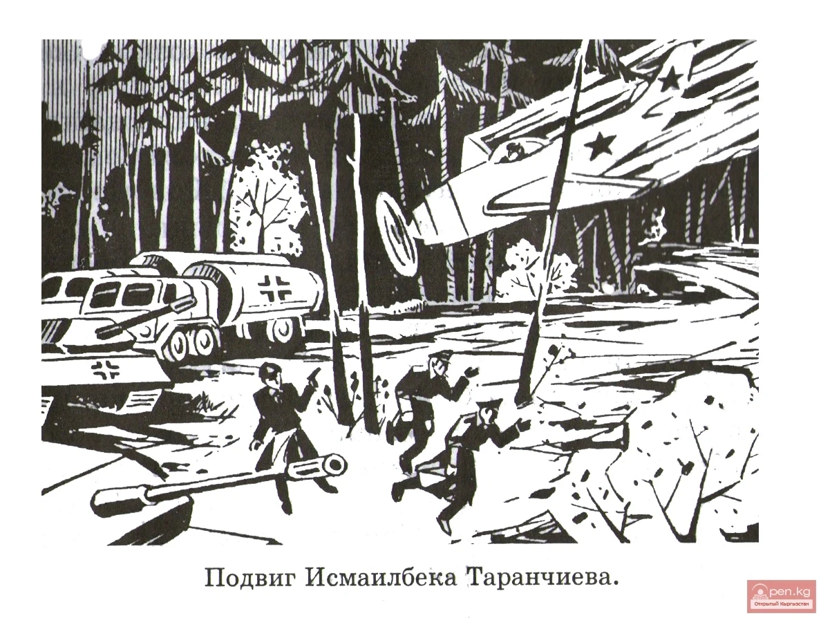Aerial Duel. This occurred on March 18, 1944, in Estonia, 20 kilometers from the city of Narva. During an air battle, a bullet hit the plane of Kyrgyz pilot Ismailbek Taranchiev, a native of the village of Besh-Kungey in the Alamudun district. The aircraft caught fire. With steady hands, he directed the burning plane towards a fascist fuel depot. Two enemy fuel tanks and 6 tanks exploded in the air.