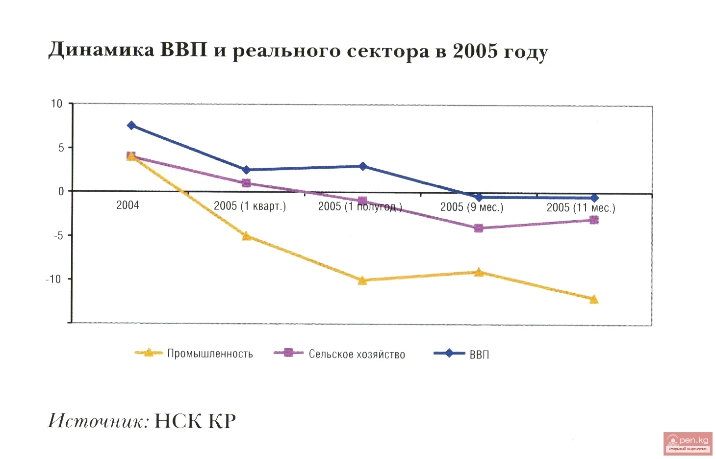 The most significant impact on GDP growth was due to the fact that industry in Kyrgyzstan produced 12.1% less in 2005 than in the previous year.